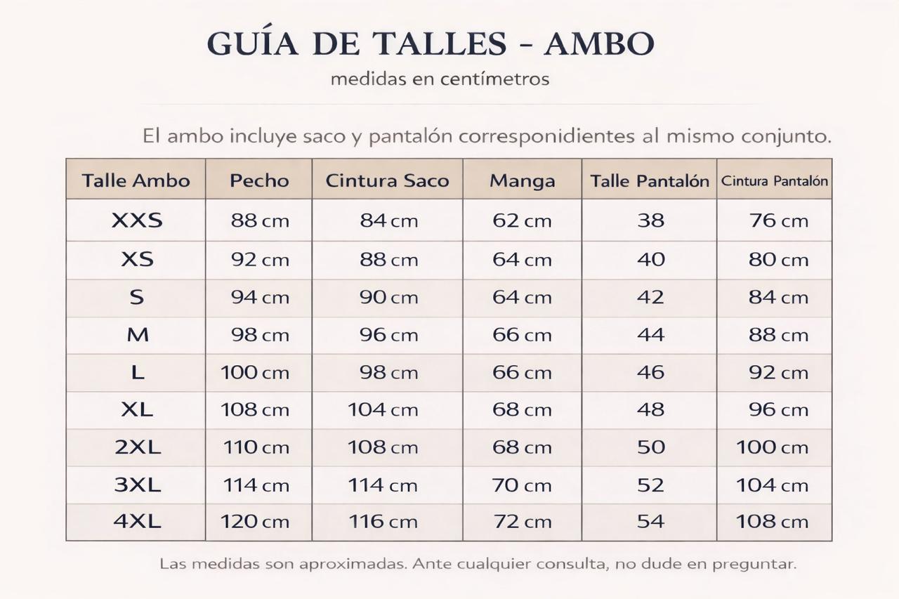 • Pantalón a tono (los talles van combinados, por ejemplo: saco XS corresponde a pantalón 40)